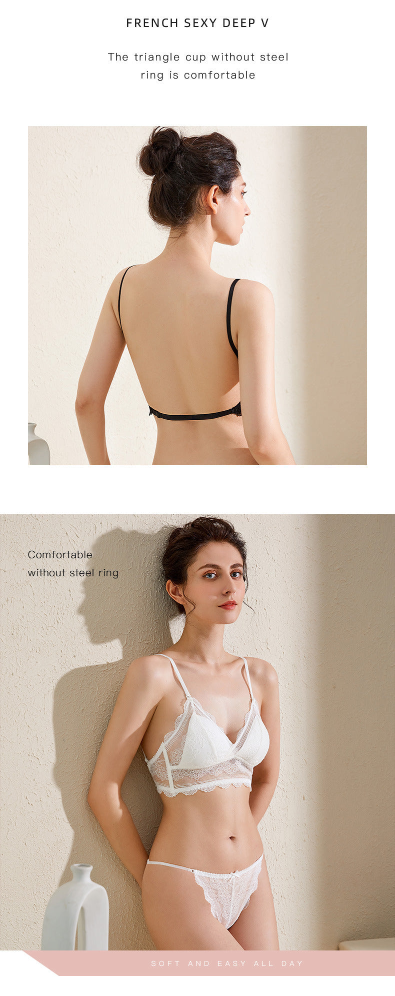 Summer Hot Selling U-Shaped Backless Bra Sexy Lace Wireless Thin Bra French Triangle Cup Set (Langery)