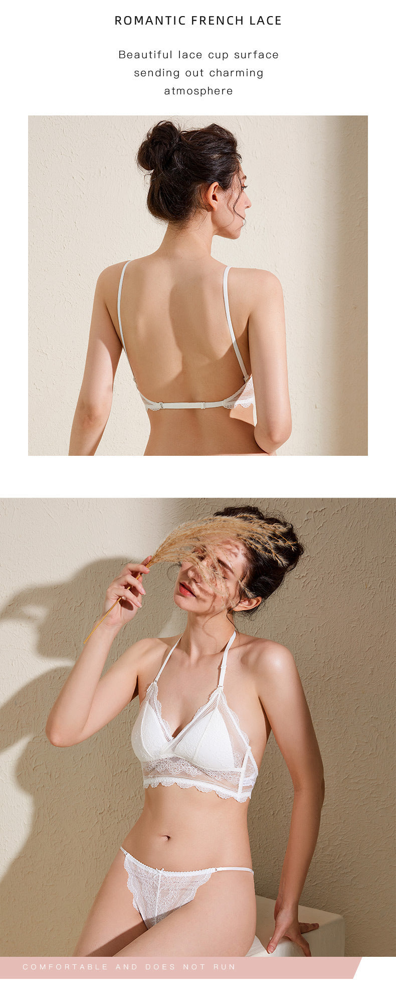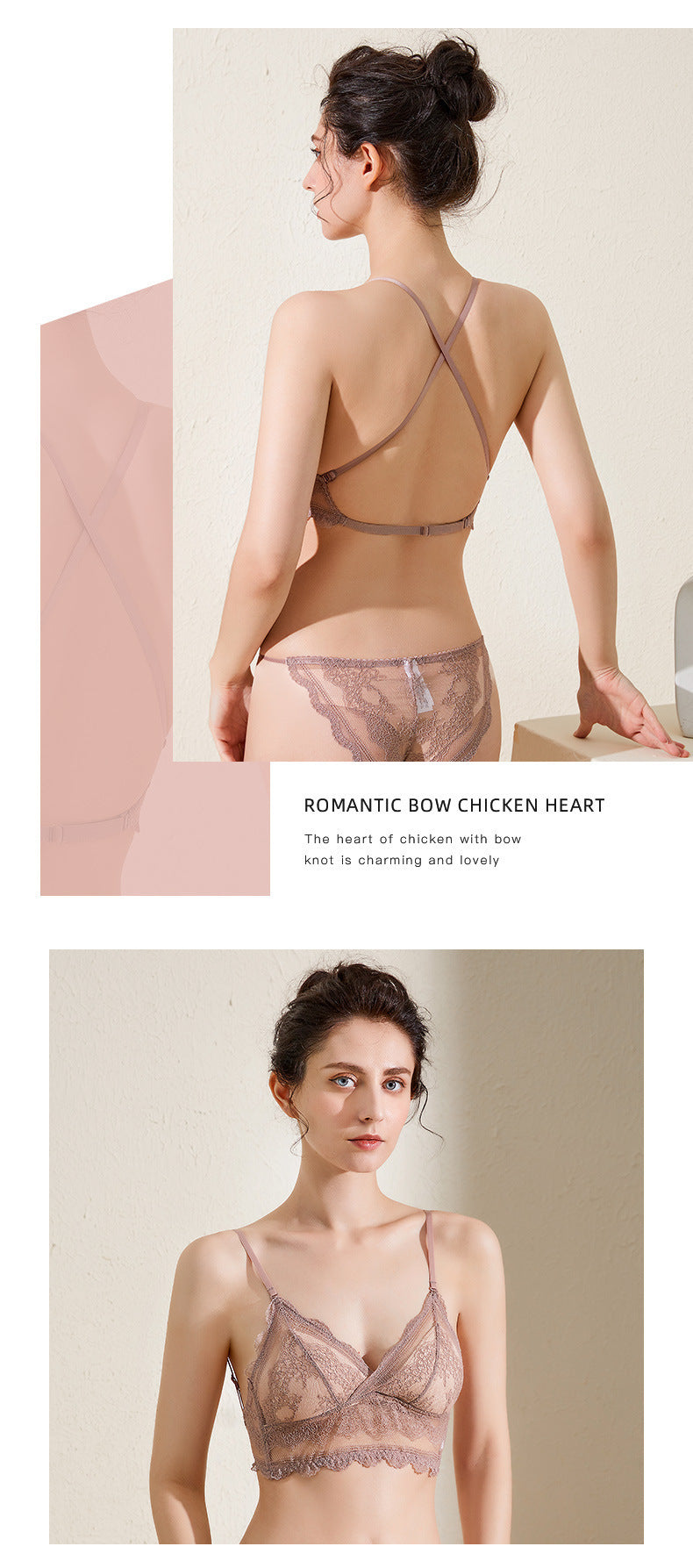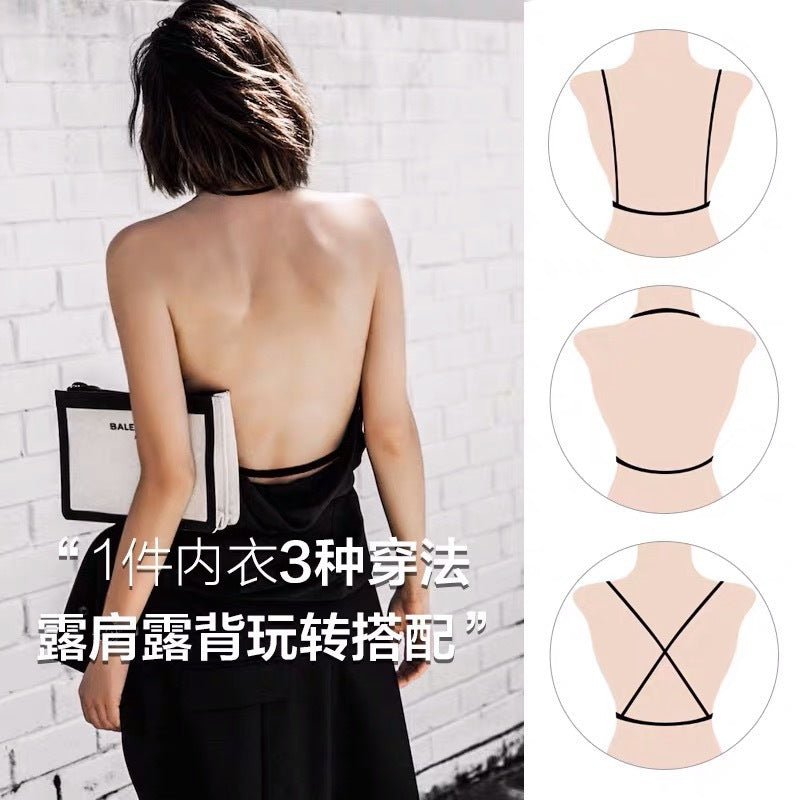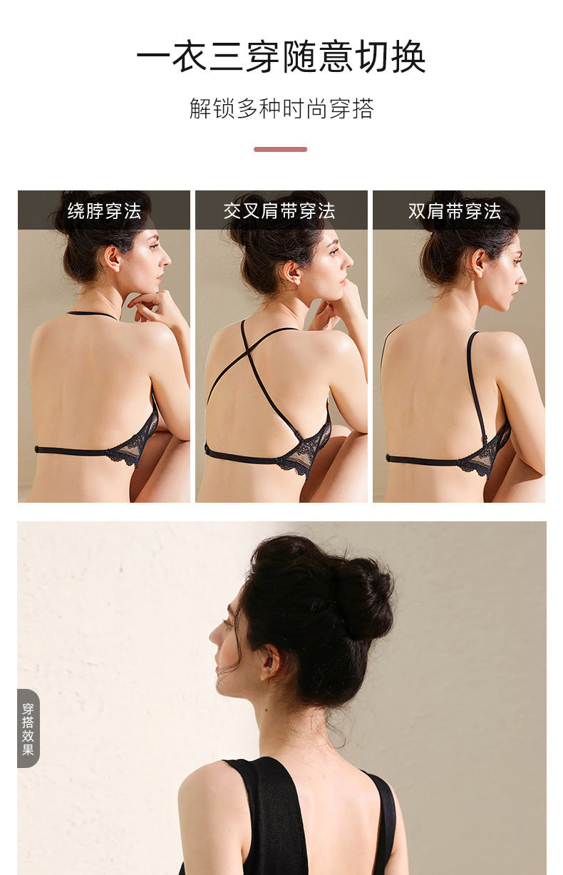 Ultra-thin lace backless bra set for women, push-up bra, transparent, comfortable and breathable.