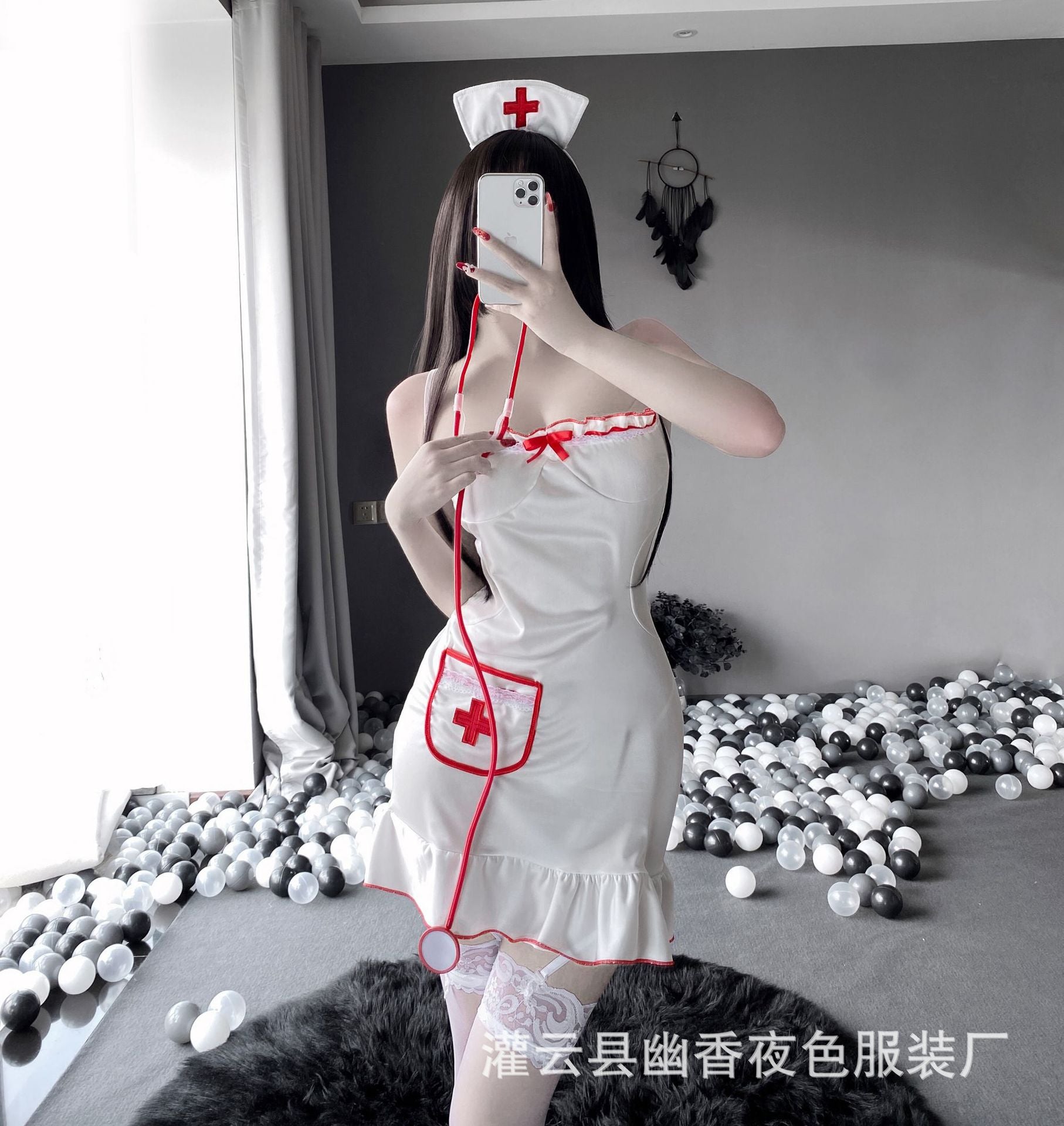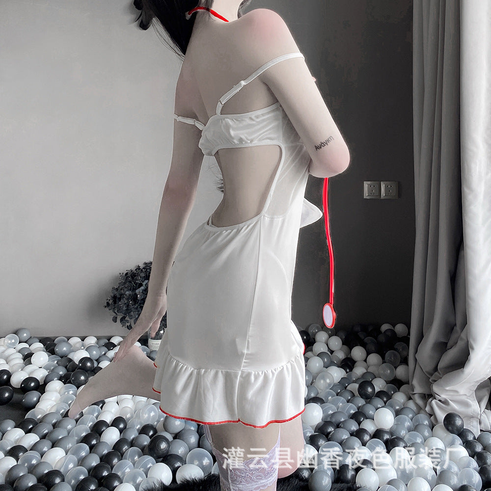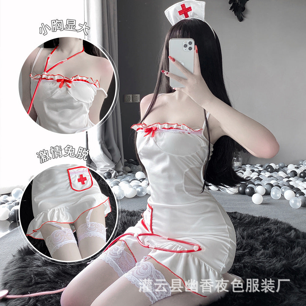 Sexy lingerie, glossy nurse uniform, seductive see-through deep V-neck ruffled bodysuit, sexy lingerie.
