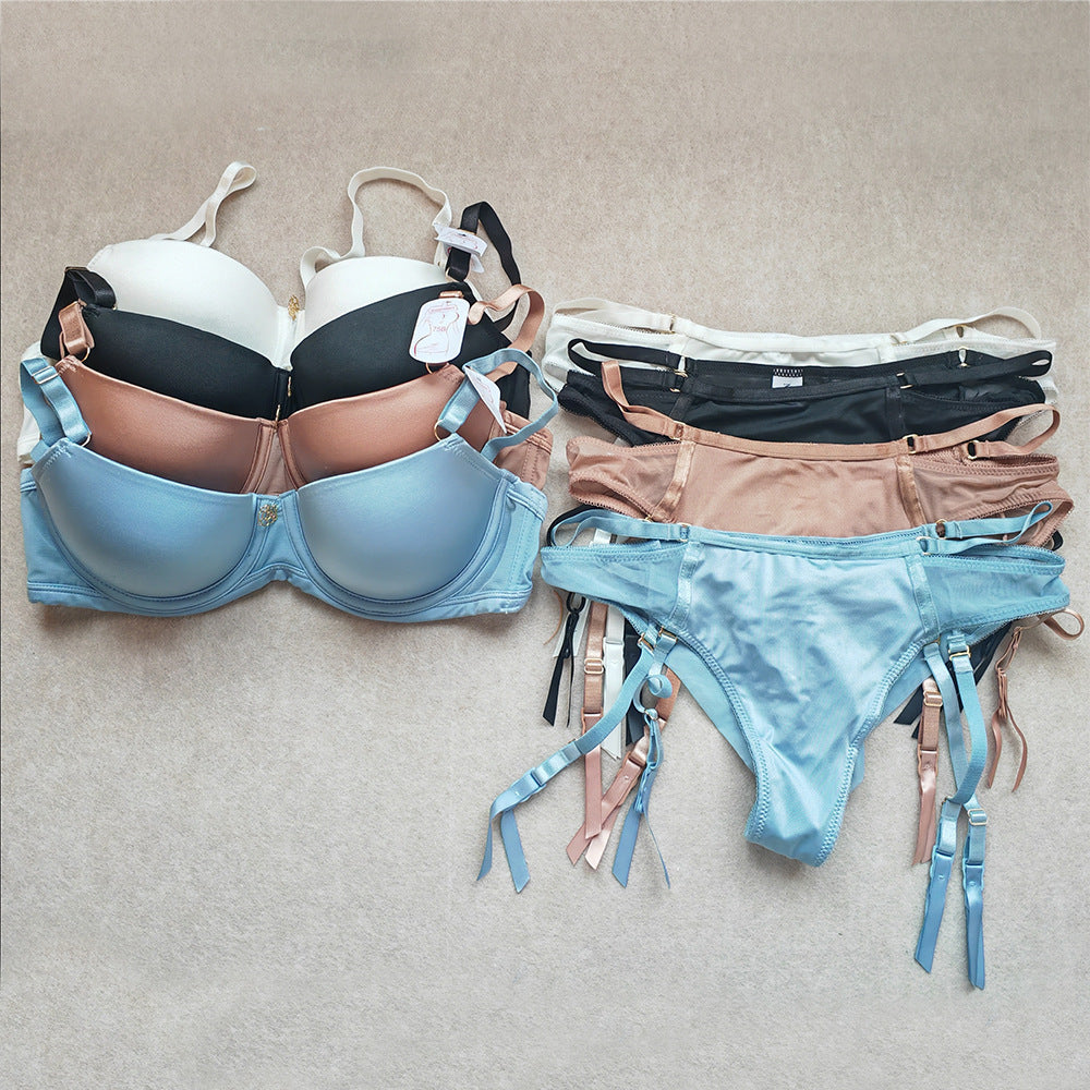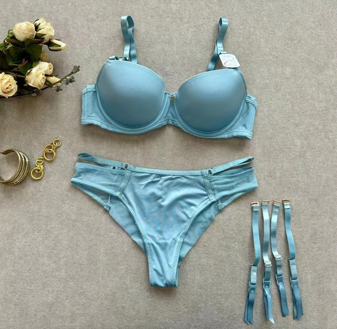 New high-end glossy textured bra set, thin at the top and thick at the bottom, providing support and lift. Includes detachable pantyhose and garter belt. (Langery)