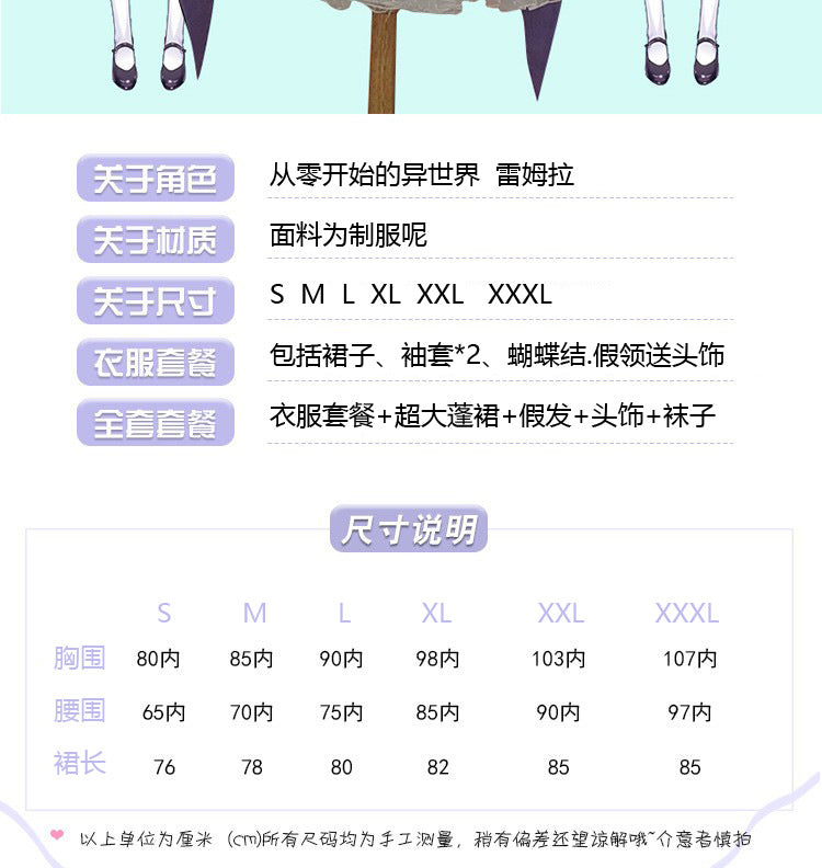 Re:ゼロから始める異世界生活 プラスサイズ レム&ラム コスプレメイド服 アニメスタイル (品番 : 650812891004_YFTC(STS)_S) ¥6,814 JPY ¥9,734 JPY 29% OFF 3988 在庫あり 色: 衣類パッケージ(帽子を含む) 衣類パッケージ(帽子を含む) レーストリムの白いストッキング 白いニーハイソックス ペチコート 大きなパフスカート レムウィッグ ラムウィッグ 新しい革靴 黄色のステッチの革靴 白ステッチの革靴 サイズ: S S M L XL XXL XXXL フリーサイズ 35 36 37 購入数 カートに追加 商品説明 色移りを防ぐため、衣類の濃い色の部分は薄い色の部分と分けて洗ってください。 洗濯機で洗わないでください。漂白剤を含む洗剤は使用しないでください。 ; 商品登録日 February 06, 2026 タグ # cosplay # 从零开始