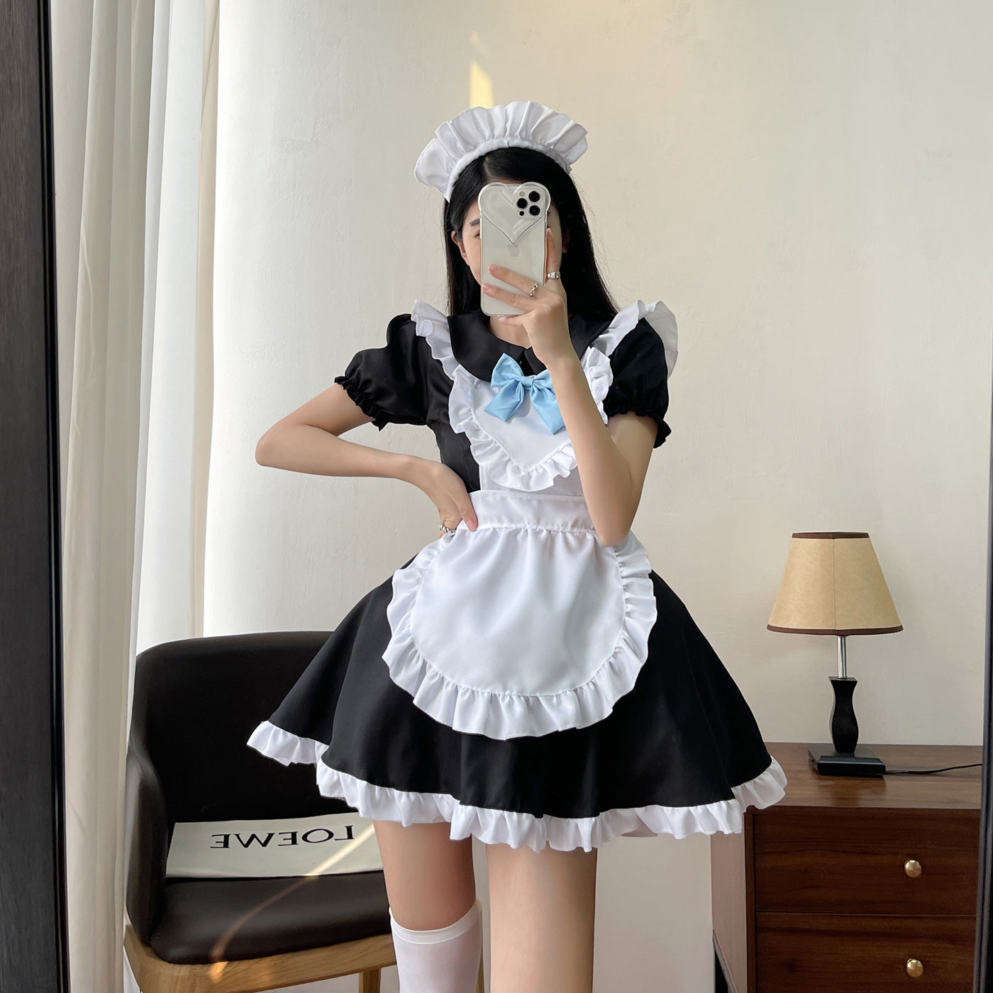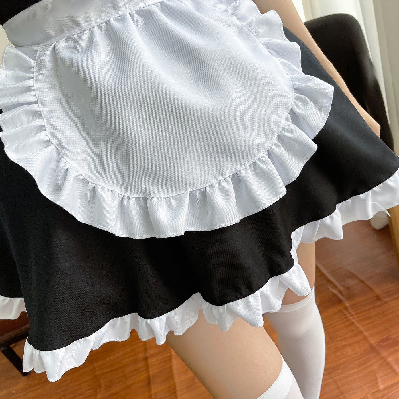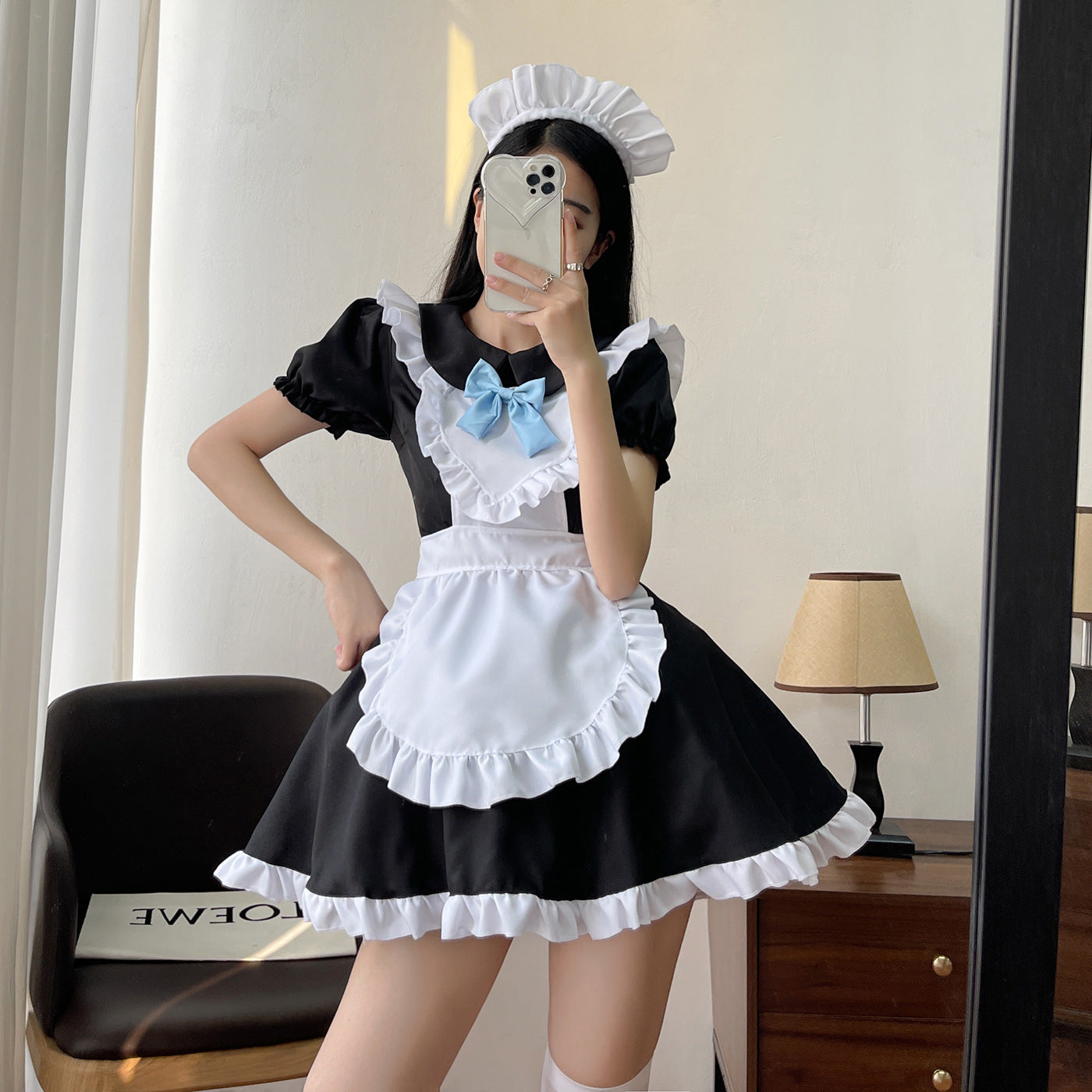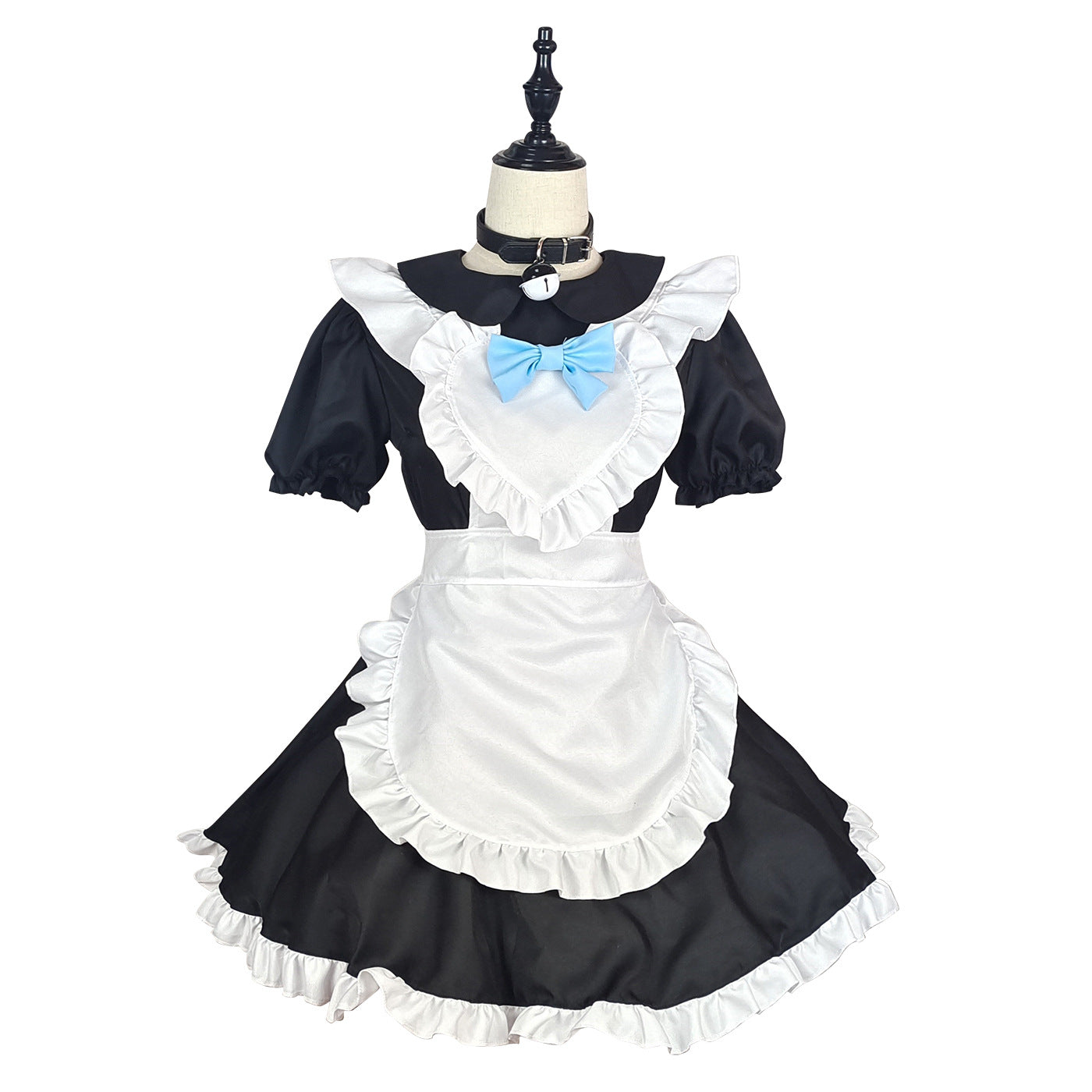 衣装セット: ドレス + エプロン + ヘッドピース + ネックラインの青いリボン