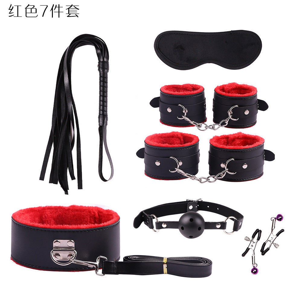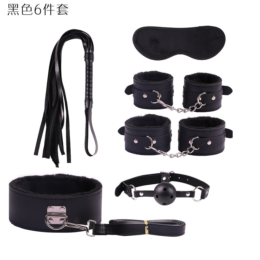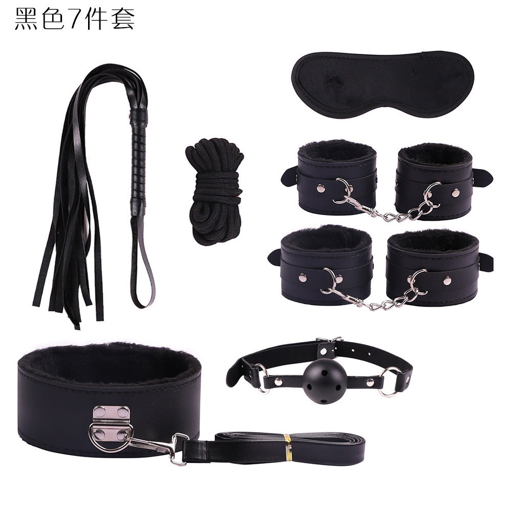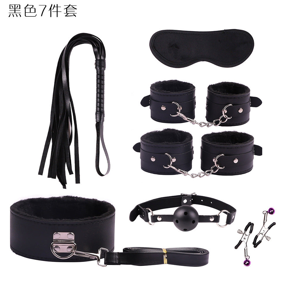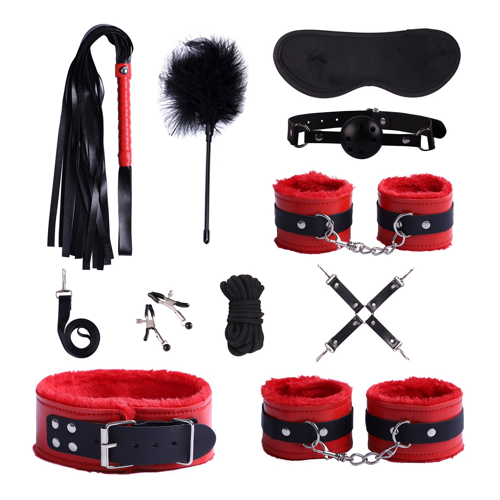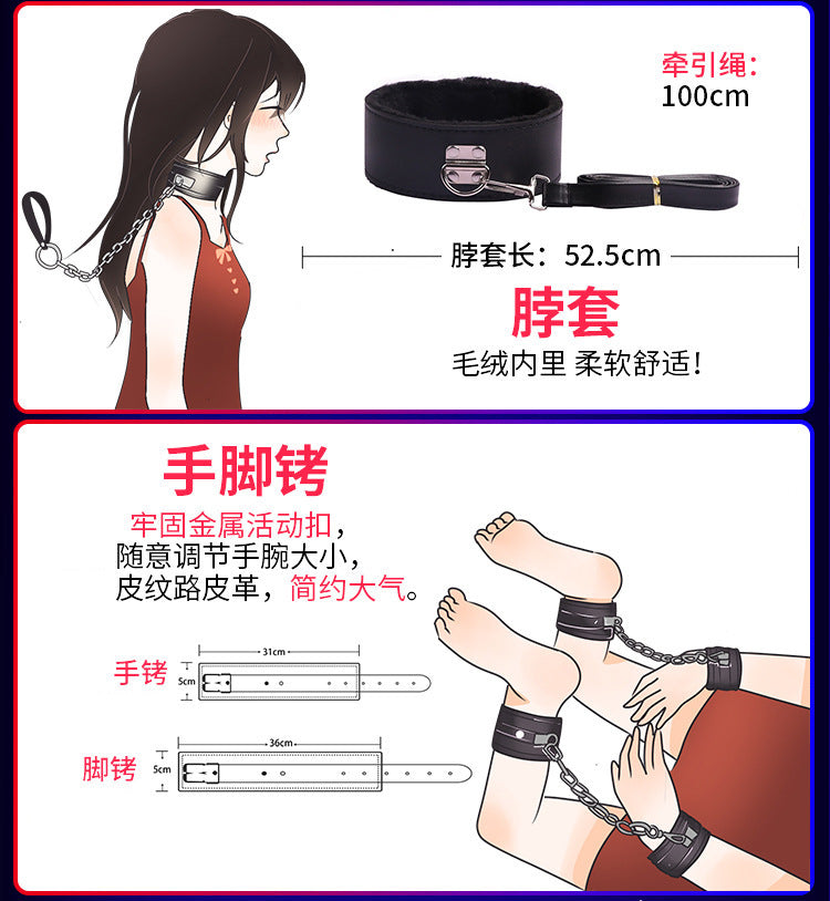 首輪、鎖、猿ぐつわ、目隠し、鞭、手錠、足かせ