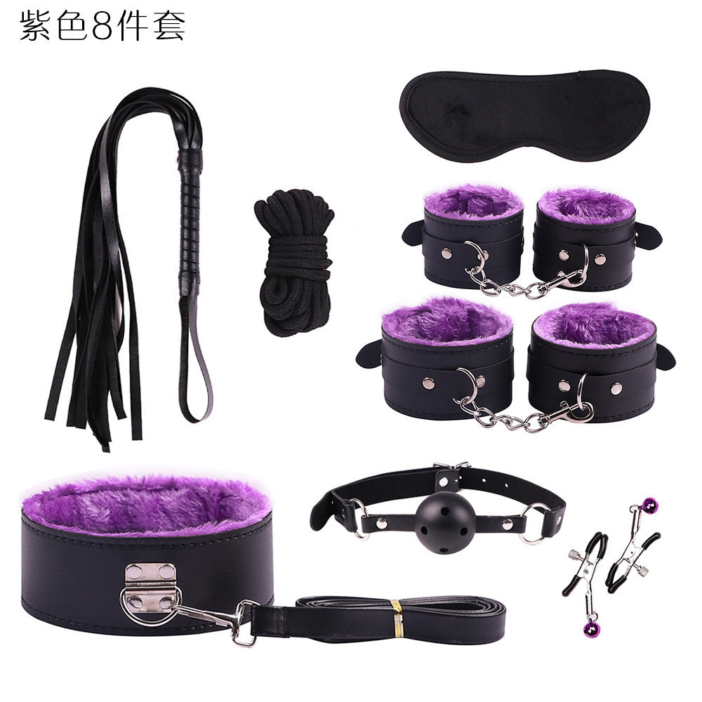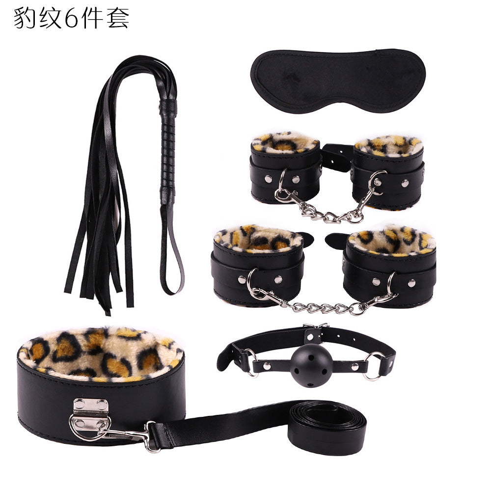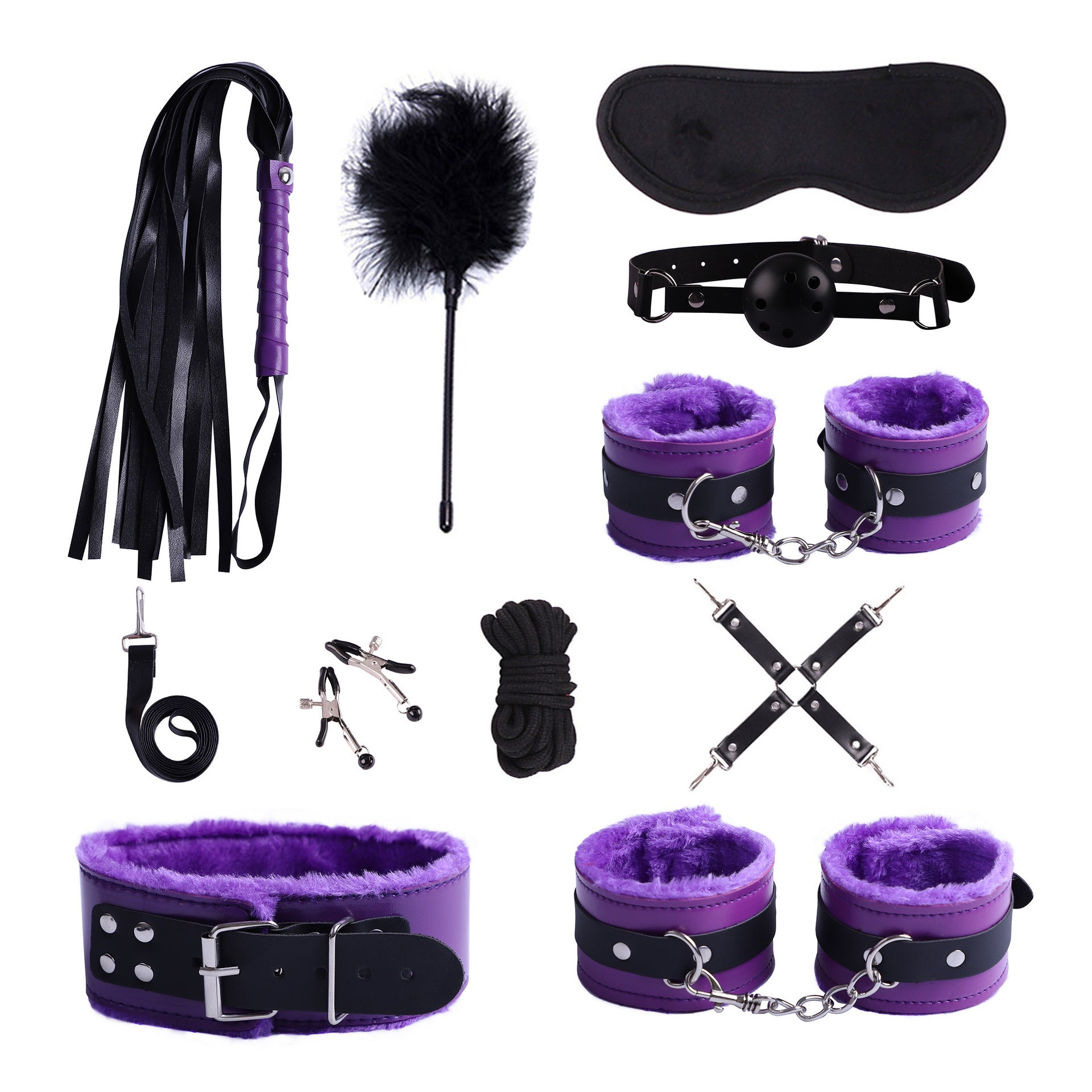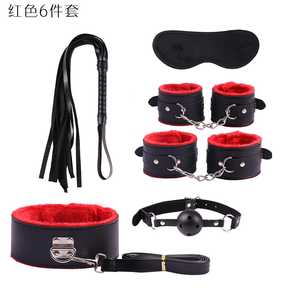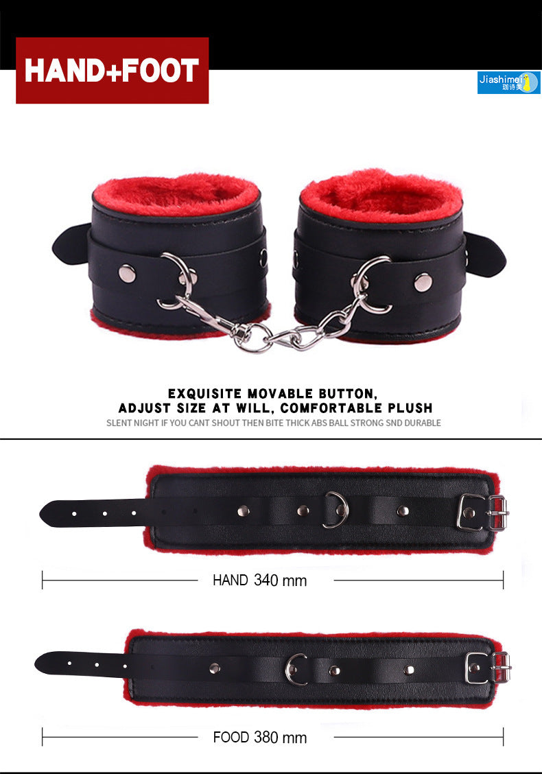 首輪、鎖、猿ぐつわ、目隠し、鞭、手錠、足かせ