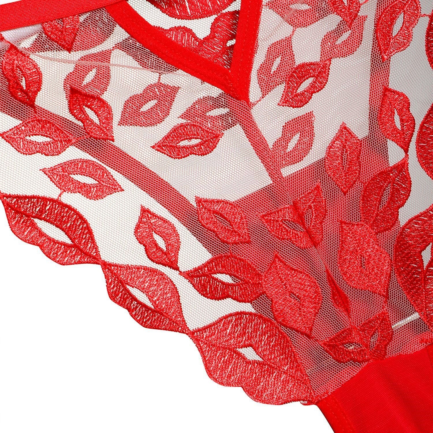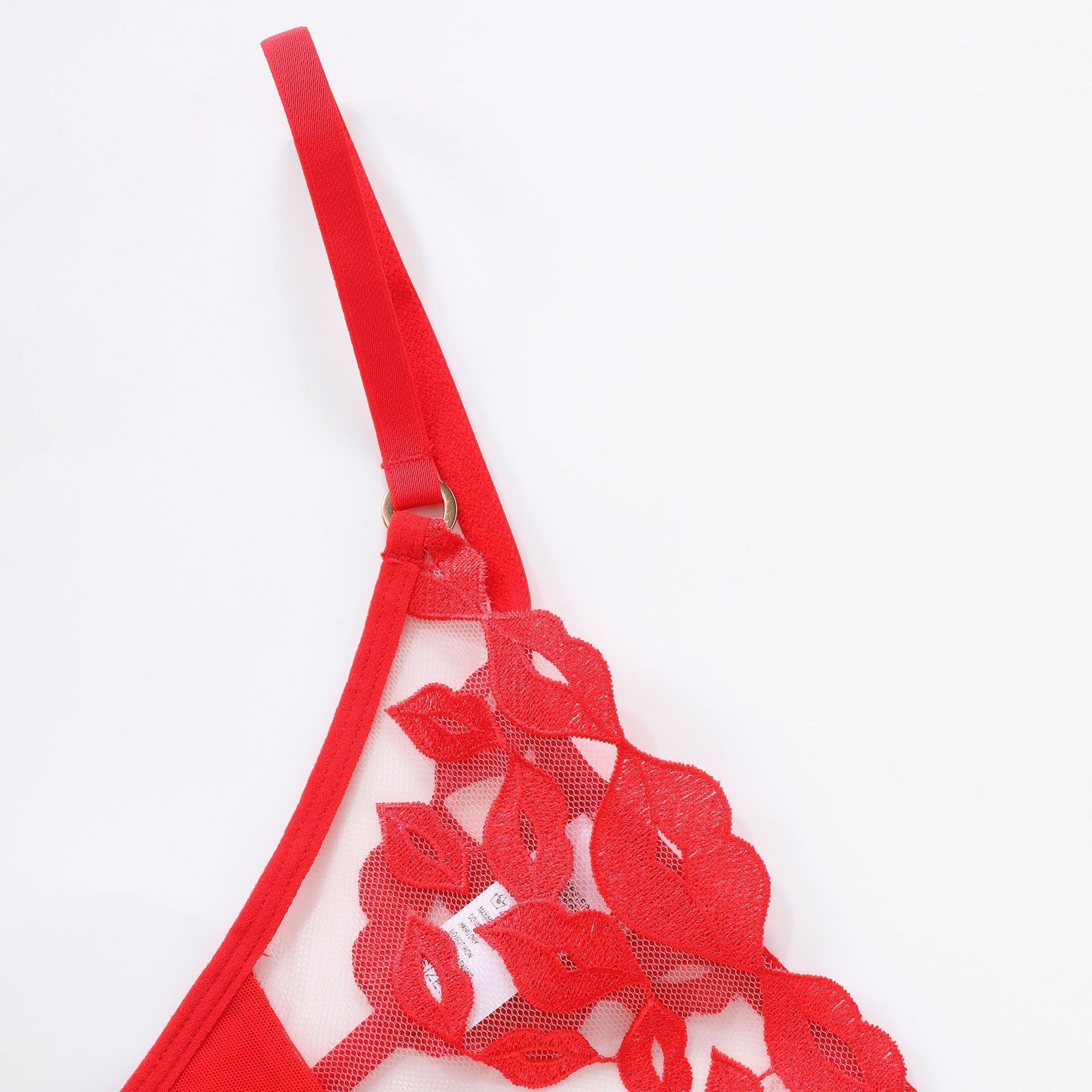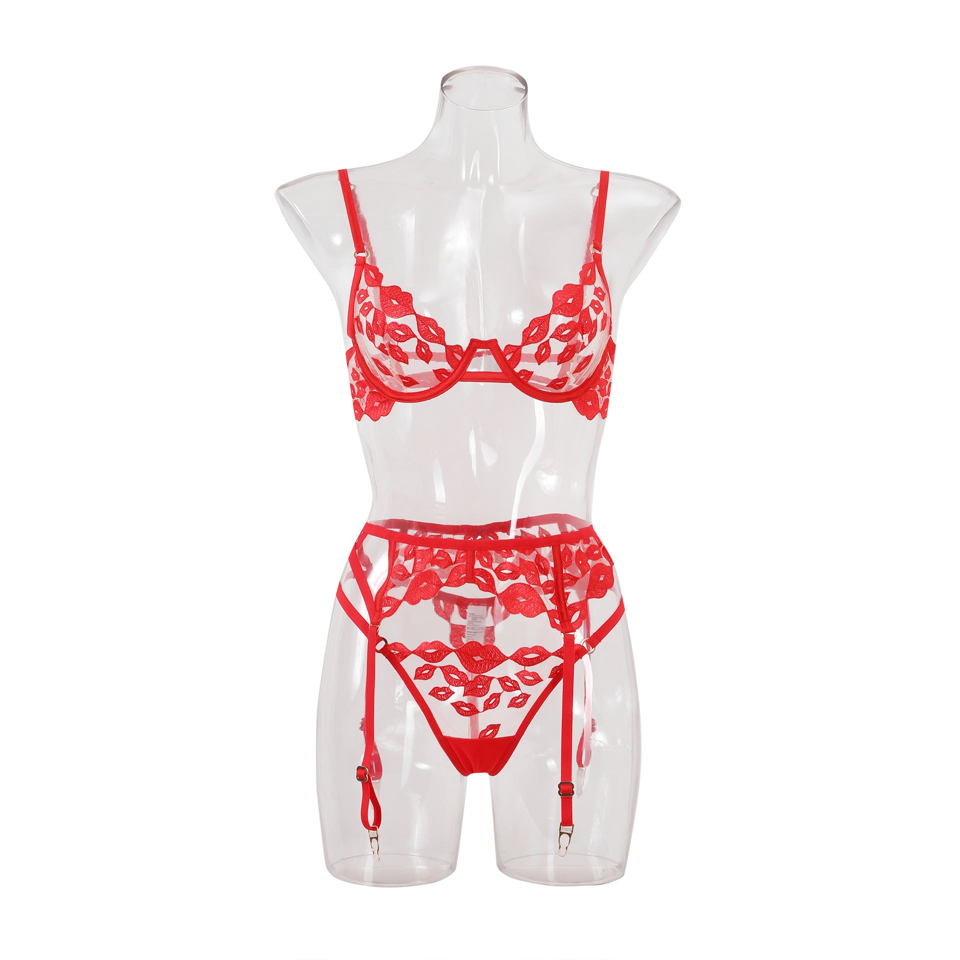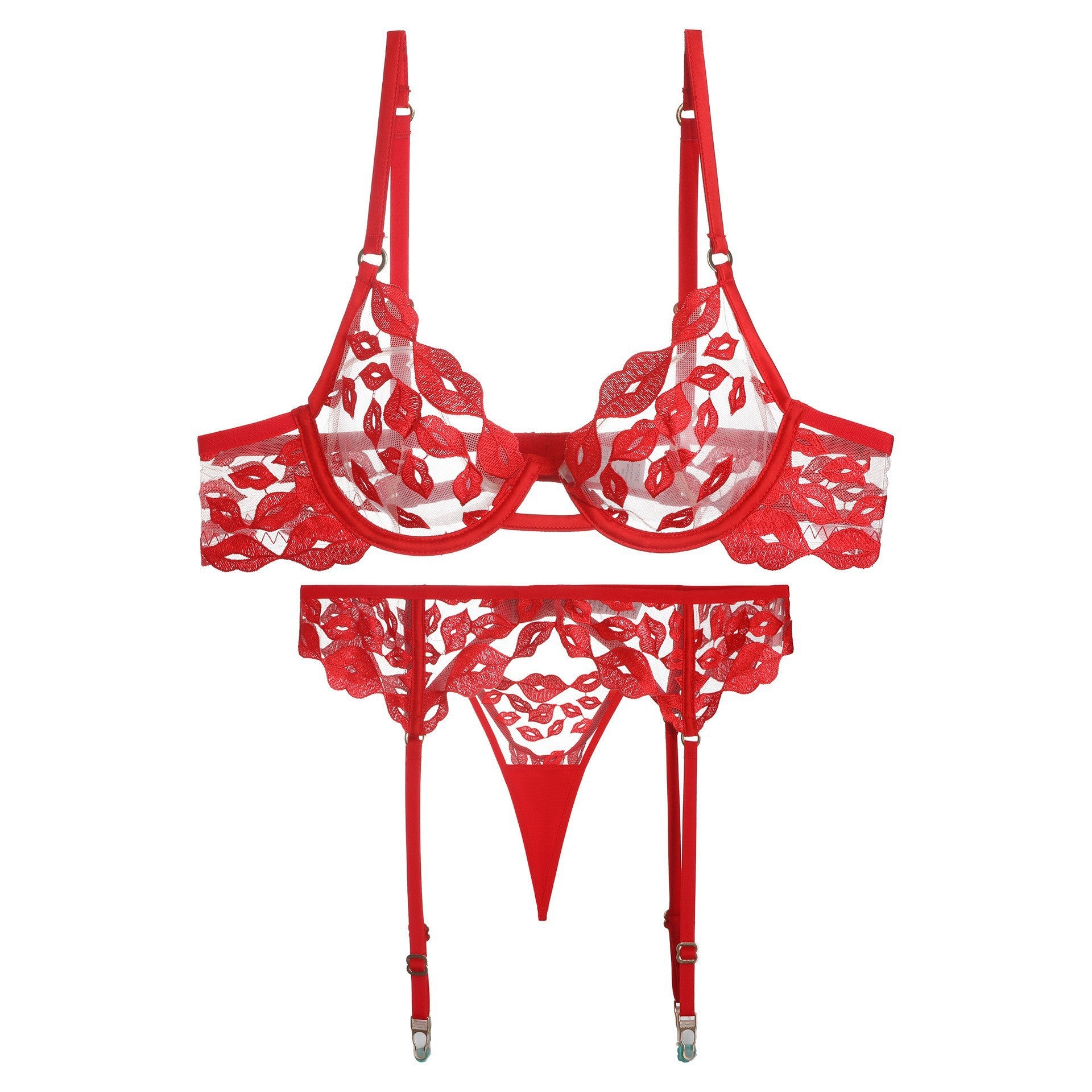 性感情趣内衣超薄红唇刺绣蕾丝内衣大胸显小防下垂文胸三件套ランジェリー
