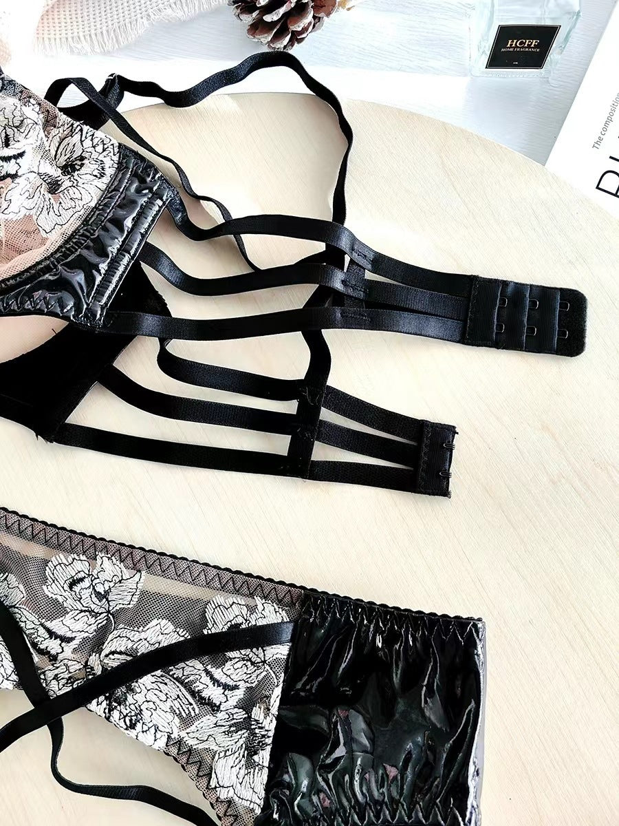性感情趣内衣超薄透视刺绣皮革制服文胸大胸显小文胸三件套ランジェリー