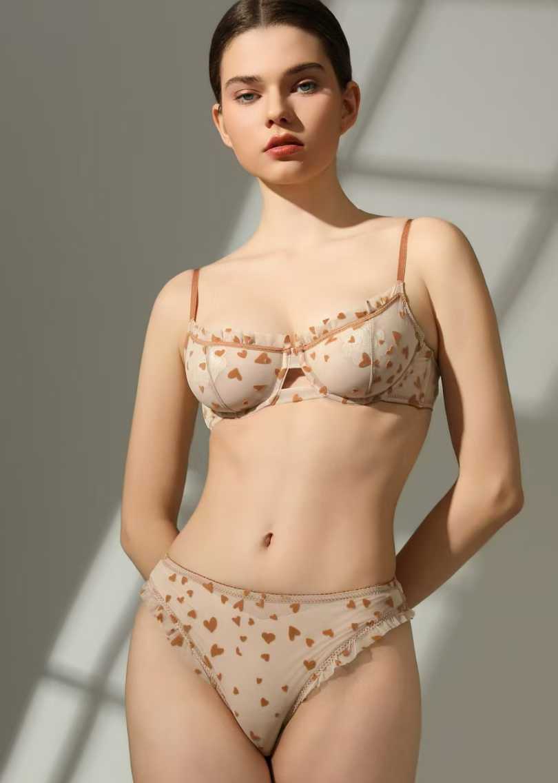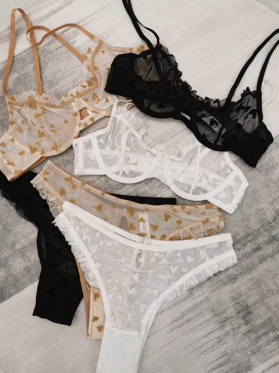 性感情趣蕾丝内衣超薄透视心形印花女士内衣套装大胸显小文胸ランジェリー