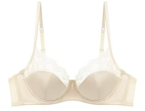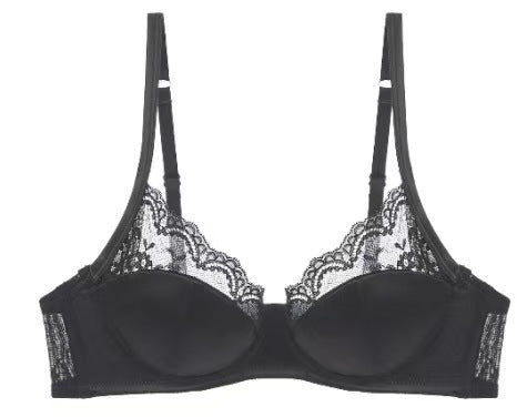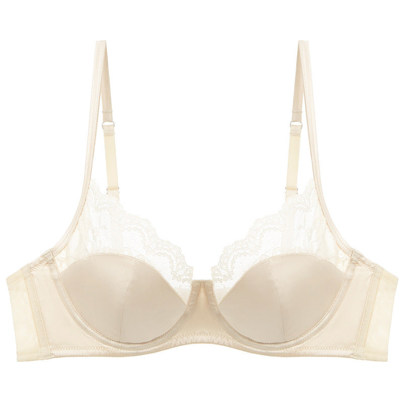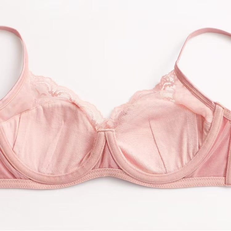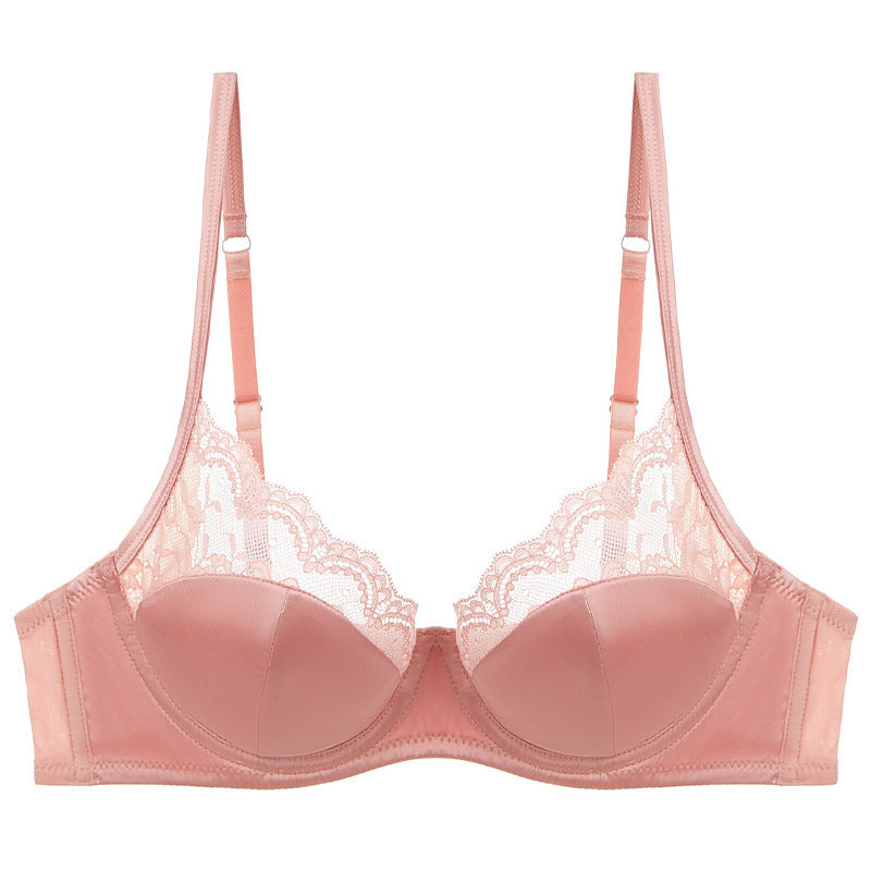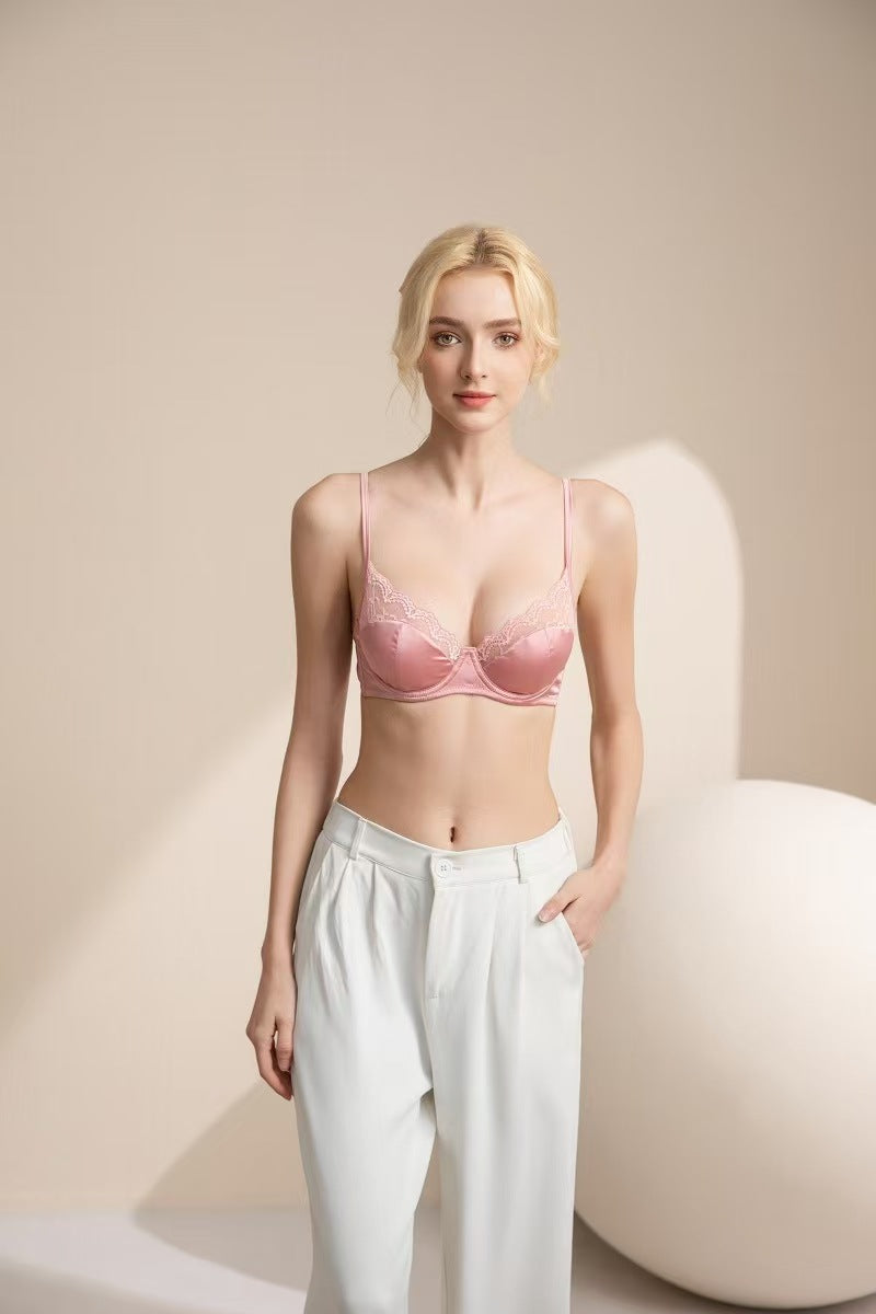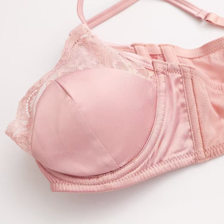 新款法式内衣女性感薄款色丁拼接蕾丝文胸大胸显小防下垂大码内衣ランジェリー