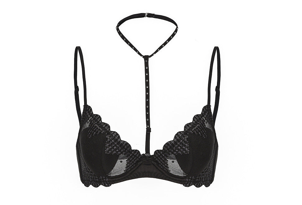 法式内衣小胸显大聚拢防下垂内衣薄款挂脖爱心网纱刺绣性感文胸罩ランジェリー