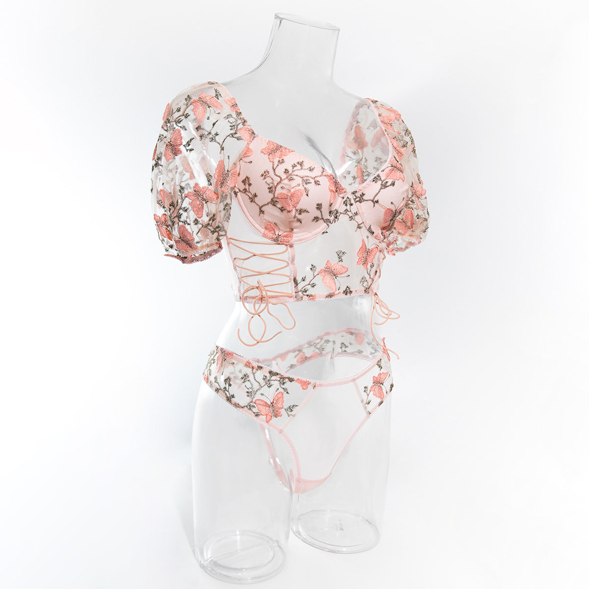 热销少女粉蝴蝶刺绣泡泡袖透视露脐修身欧美辣妹性感情趣内衣ランジェリー