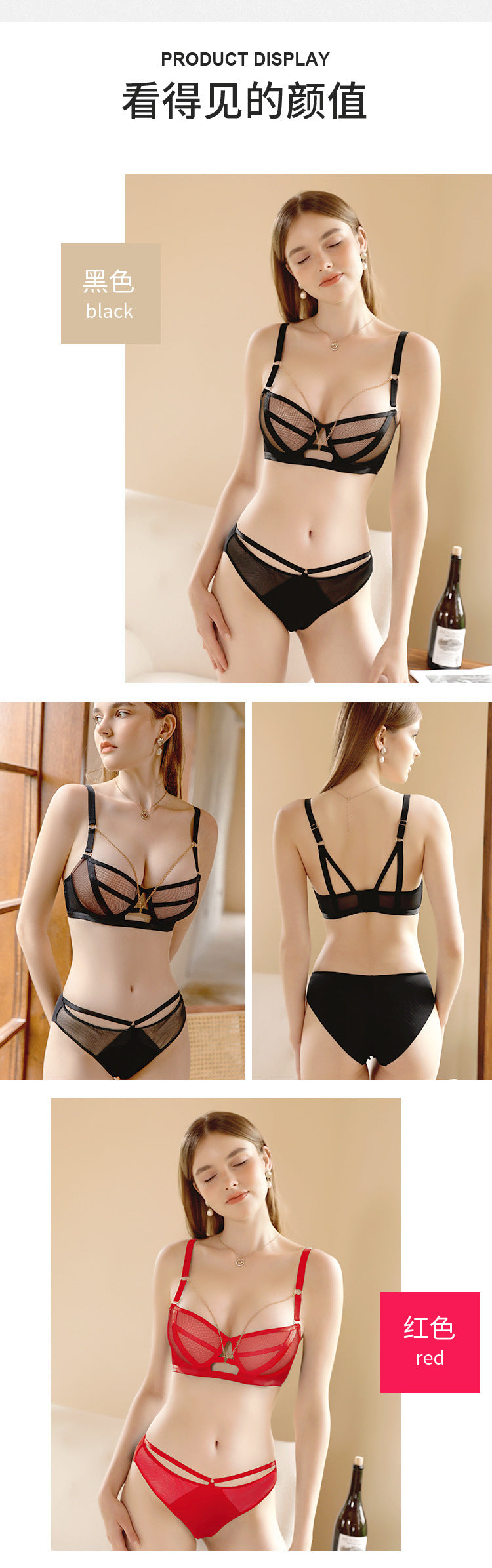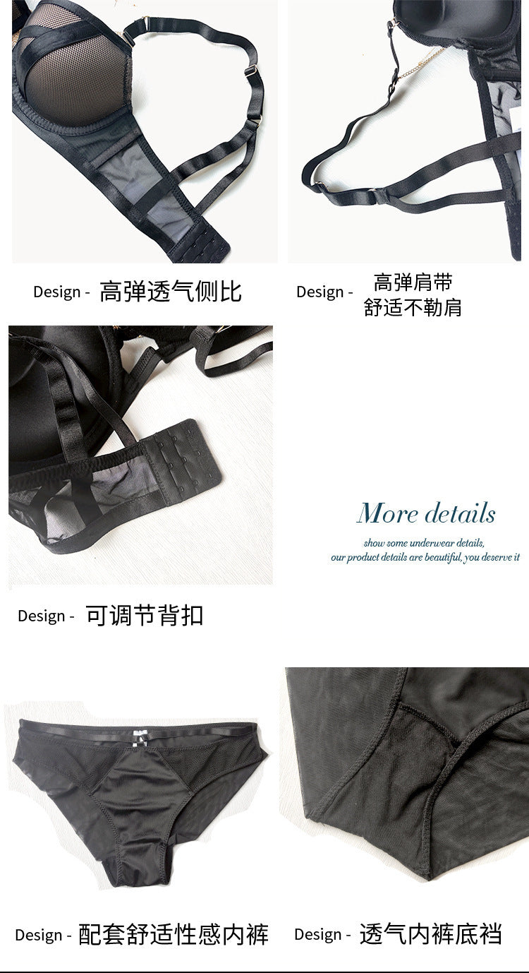 23爆款大网纱绑带撞色内衣女链条可拆卸美背美胸带本命红文胸套装ランジェリー